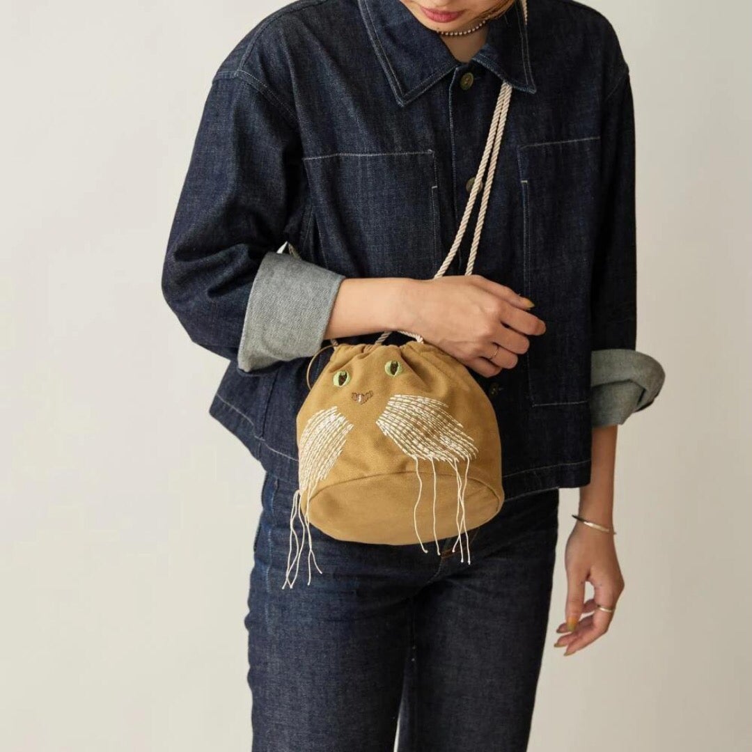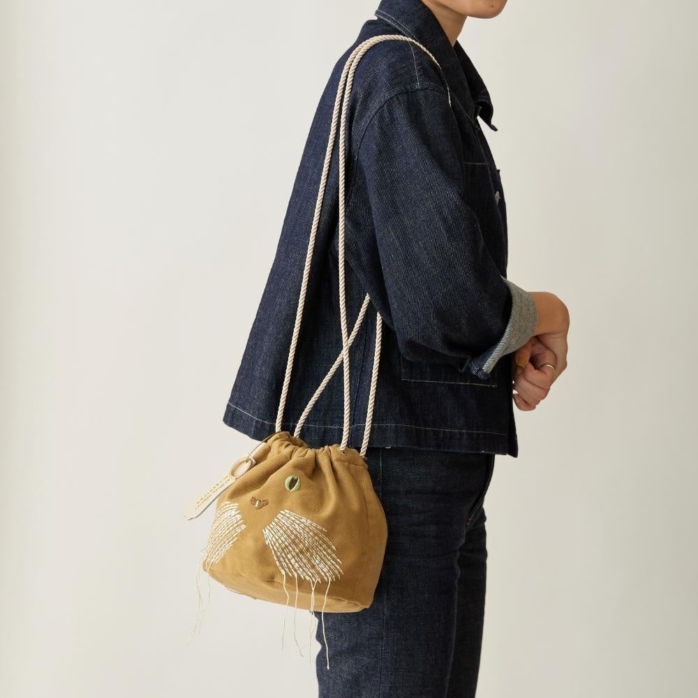 おひげに見立てたフリンジがゆらゆら揺れるのがこの巾着の特徴のひとつ。茶トラ猫に多い、白髭(白い刺繍糸)で再現しています。